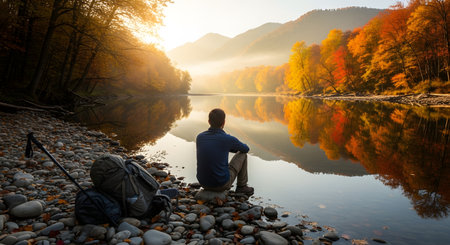 A male hiker takes a break, sitting by a calm river in a stunning autumn forest with colorful foliage. He looks out at the misty mountains and sunrise, with his backpack and trekking poles resting nearby.