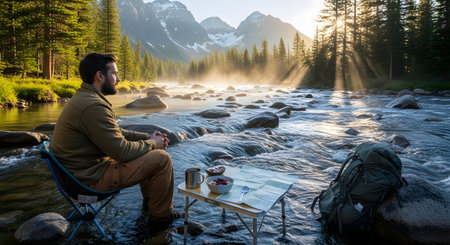 A man sits on a camping chair by a rushing river, enjoying breakfast at a small folding table as the sun rises over majestic mountains. His backpack rests on a rock nearby, capturing a moment of solitude and appreciation for nature during a wilderness adventure.