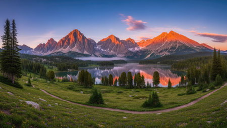 In the morning light a serene landscape unfolds, where the tranquil lake reflects the majestic mountains and their enchanting surroundings, creating a scene that feels both timeless and magical