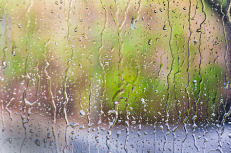 Drops of water flow down the glass in the rain