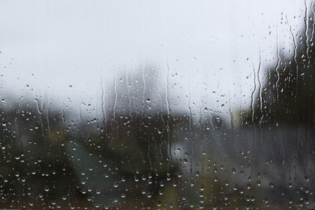Window glass with water drops, closeup. Rainy weather