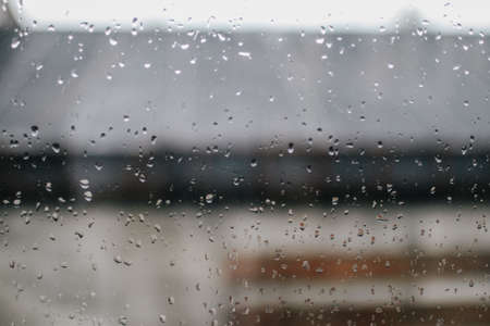 Drops of rain on the window. Rainy days in the city landscape. Defocused