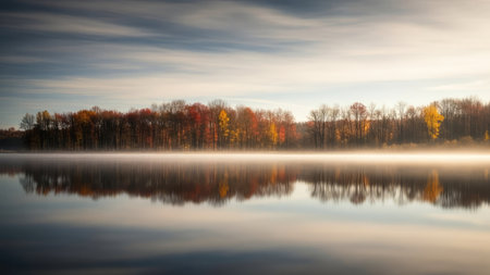 A tranquil landscape captures a reflective lake scene under a cloudy sky. Autumn trees with vibrant red and yellow leaves line the horizon. The composition uses soft lighting and long exposure, creating a misty atmosphere. Suitable for environmental, travel, and seasonal commercial projects.