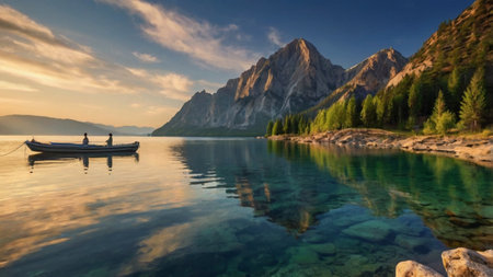 A breathtaking sunset over a still mountain lake, with the reflection of the colorful clouds in the water.