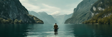 A calming drone perspective captures a solitary kayak navigating the smooth surface of a peaceful lake. Lush forests and foggy mountains frame the serene waters, enhancing the sense of solitude.