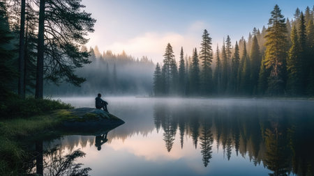 A person is silhouetted, sitting and looking out over a calm lake. Evergreen trees line the shore, their reflections mirroring in the water. The scene is bathed in soft, diffused light, possibly early morning, with a hint of mist. This image could be suitable for environmental articles or travel publications.