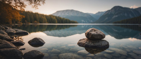 Beautiful mountain lake and natural environment in the morning background. Tranquil purple pink sunset mood lighting in panoramic mountainous and nature lake shore scenery. Picturesque generative AI