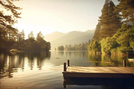 Wooden jetty on a lake in the morning. Beautiful mountain landscape.