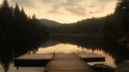 Lake in the mountains at sunset. Wooden pier on the lake.
