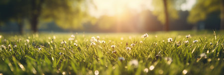 Generative AI : Beautiful wide format image of a pristine forest lawn with fresh grass and yellow dandelions against a defocused background
