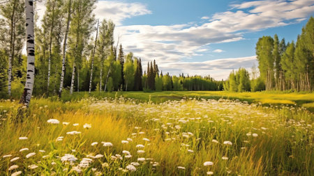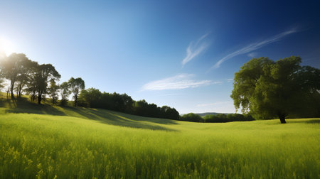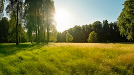 Generative AI : Beautiful panoramic landscape Natural summer spring scenery with a green field blue sky birch trees and open space
