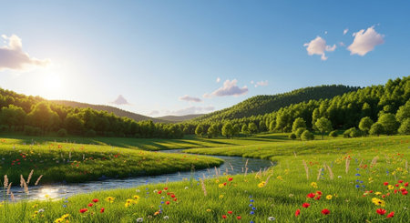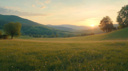 A picturesque meadow with vibrant wildflowers basking in the warm glow of the sun. The scene captures a peaceful moment in nature, showcasing lush green grass and colorful blossoms.