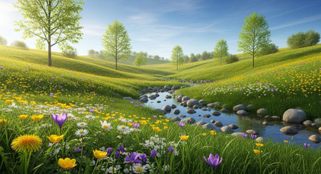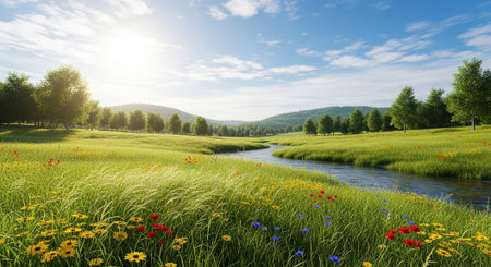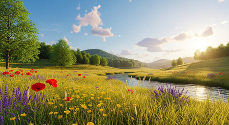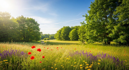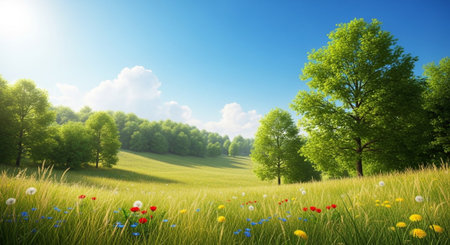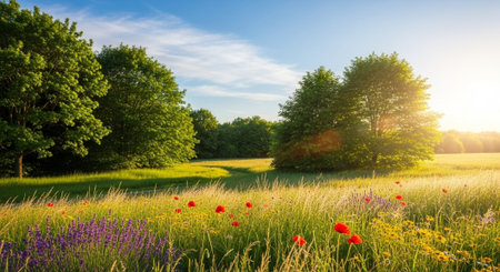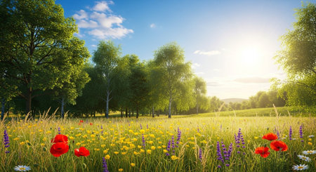 Idyllic landscape with wildflowers, trees, and sunny sky