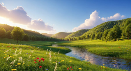this photo showcases stunning 3d nature scenes featuring a serene lake, flowing stream, and vibrant flowers. created in the style of unreal engine 5 by marcin sobas, the image depicts a peaceful rural life with deconstructed landscapes and a beautiful backlight. the zeiss milvus 25mm f14 ze lens captures every detail of these pastoral scenes, making for a breathtaking wallpaper. ai generated