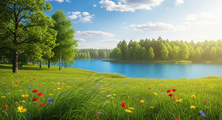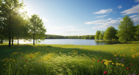 Serene lakeside meadow with colorful wildflowers and vibrant trees