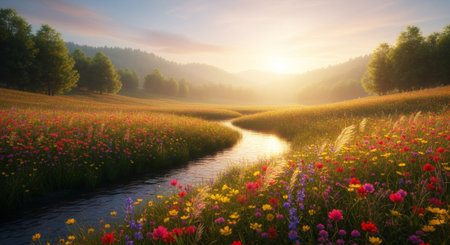 A serene meadow filled with colorful flowers illuminated by warm sunlight at sunrise. The tranquil landscape invites appreciation of nature's beauty and vibrant colors.