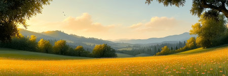 Stunning Golden Meadow at Sunset A Serene Rural Countryside Hills Landscape with Warm Sunlight
