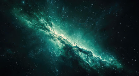 This stunning image captures the beauty of a cosmic landscape featuring vibrant green and blue clouds with shimmering stars. Perfect for illustrating the wonders of the universe and the mysteries of space exploration.