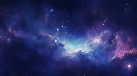 A view of a deep space nebula, characterized by swirling clouds of vibrant purple and blue cosmic gas and dust. Countless distant stars twinkle like tiny diamonds against the dark expanse of the universe. The luminous glow of the nebula creates an ethereal and mysterious atmosphere, hinting at the immense scale and beauty of celestial formations. This abstract evokes a sense of wonder and the infinite possibilities of outer space.