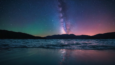 Starry night sky reflected in tranquil lake