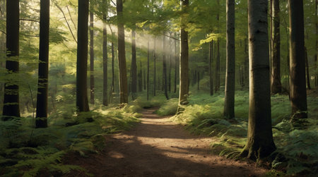Trail in the green forest with sun rays coming through the trees
