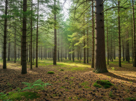 wide-angle-view of a dense pine forest, created with generative ai