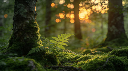 Light gently breaks through the tree canopy, creating a serene atmosphere in a tranquil forest. Delicate plants and the textured bark speak to natures beauty at dawn.