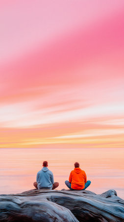 Two friends sit on a rocky beach watching the vibrant sunrise. The sky is filled with pink and orange hues reflecting on the calm water. A peaceful moment shared in nature.