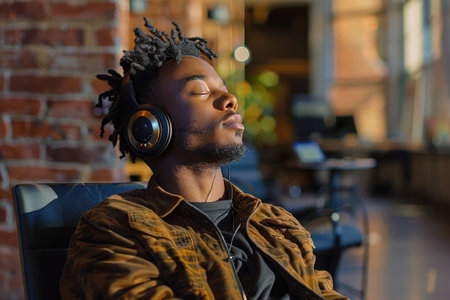 Black Man sitting on a chair in the office wearing headphones and listening to relaxing music, with his eyes closed and a calm expression on his face