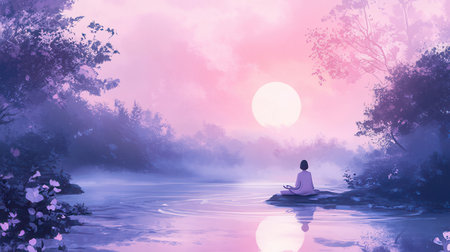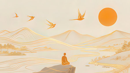 Illustration of a Buddhist monk sitting on a rock with seagulls in the background
