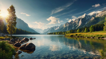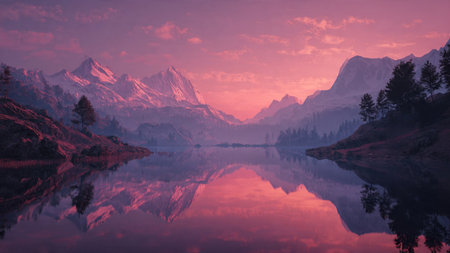 A breathtaking sunset over a still mountain lake, with the reflection of the colorful clouds in the water.
