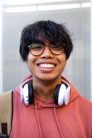 Vertical portrait of happy and smiling teen asian boy wearing glasses and headphones. Headshot.