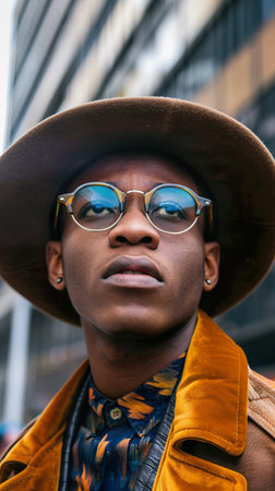 Confident African American Businessman with Glasses, Happy and Stylish, Posing Outdoors Near a Metro Station