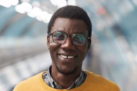 Portrait of African American man in eyeglasses smiling at camera standing on escalator in underground