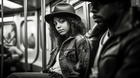Confident young woman with curly hair wearing a leather jacket and hat, sitting on the subway