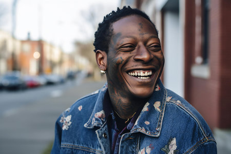 portrait young african man standing outdoors with glasses laughing and looking at camera, with brown textured background behind him, lifestyle concept.