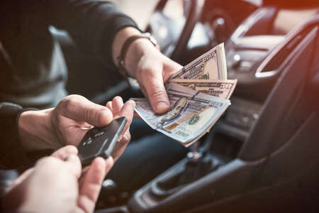 Male hands counting US Dollar bills or paying in cash. Pay expenses.