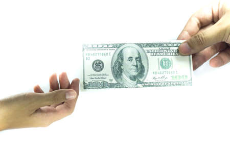 Hand giving money like bribe or tips isolated, hard worked hand taking dollars money. Currency transfer on white background. Reward for hard work.