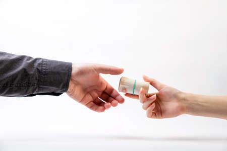 A female hand gives a bribe, roll of money, the male hand in a shirt. Side view. White background. The concept of the world anti-corruption day, 9 December.