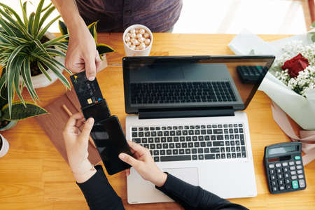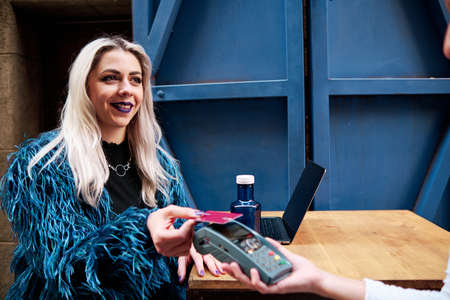 Woman paying with credit card for the order