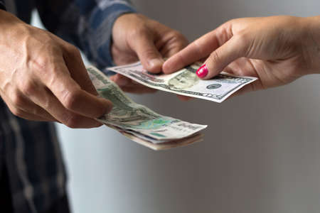 Payment for the purchase. Close up of one hundred dollar banknotes in female hands while paying for the purchase