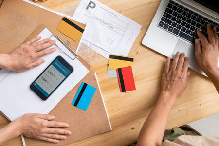 View of young female managers hands over workplace during checking information