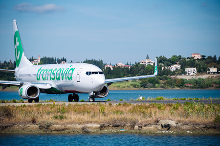 Corfu, Greece - September 19, 2020: Transavia Boeing 737-800 airplane at Corfu Airport in Greece. Boeing is an American aircraft manufacturer headquartered in Chicago.