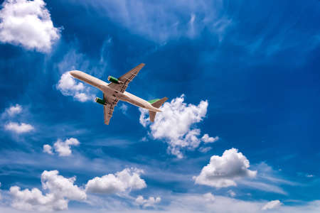 Flight in bad weather. Airplane flying under dramatic storm clouds.