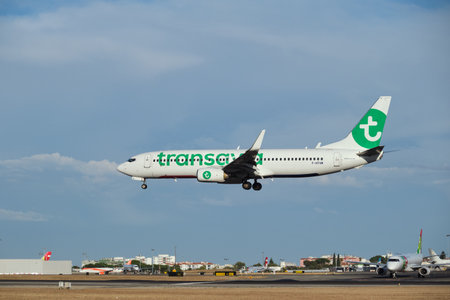 Lisbon, Portugal - September 2, 2023: Transavia Boeing 737-82R passenger plane landing in Humberto Delgado Airport in Lisbon