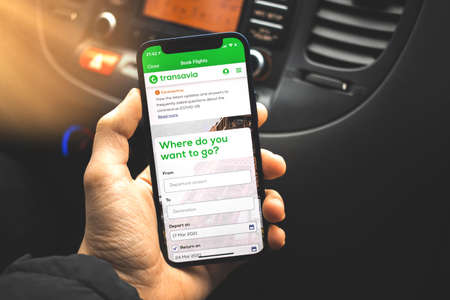 Kharkov, Ukraine - March 17, 2021: Transavia booking flight tickecks by mobile app, on the smartphone
