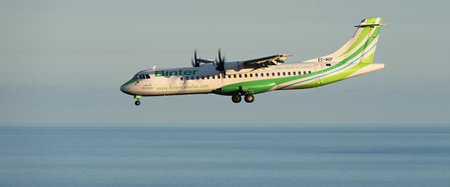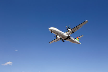Tenerife, Spain June 4th, 2023. ATR 72-600 of Binter Airlines flies in the blue sky, landing at Tenerife Airport over the ocean