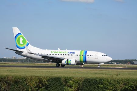 Rotterdam, Netherlands – April 20, 2015: Transavia Boeing 737 airplane at Rotterdam The Hague airport (RTM) in the Netherlands.