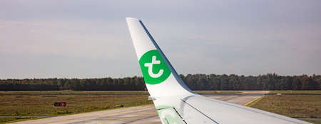 Eindhoven Netherlands. October 14, 2019. Transavia logo on a plane wing at Eindhoven airport. View out of airplane window.