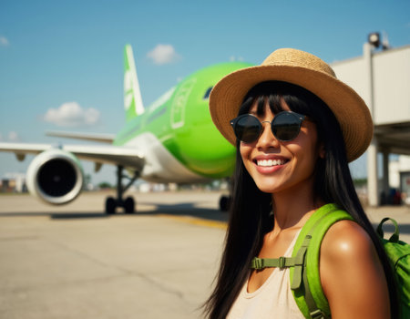 Portrait of smiling young Asian woman with backpack and hat standing in front of airplane